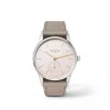 The Orion is the quiet star among NOMOS timepieces and a secret favorite of many. Almost all the designers who work for the watchmaker wear it. The curve of its exceptionally thin case (33 x 8.5 millimeters) and camber of the crystal ensure a timelessly elegant impression separate of any short-term fashion trends. The Orion 33 White, reference 325, is driven by a hand-wound Alpha caliber, a NOMOS movement from the very beginning. Its striking, quintessentially Glashütte embellishments are put on display through the sapphire-crystal case back. The Orion 33 White, reference 325, is provided with a light suede strap made of calfskin.
