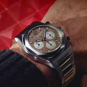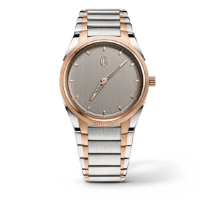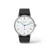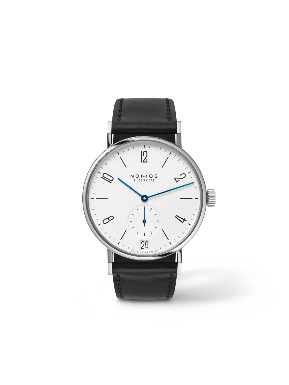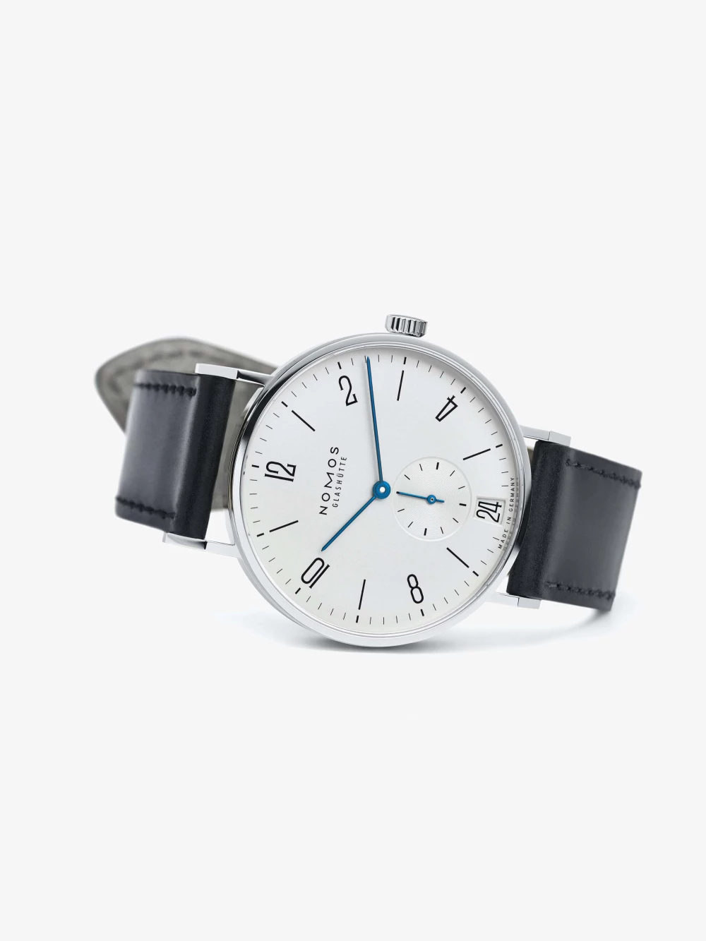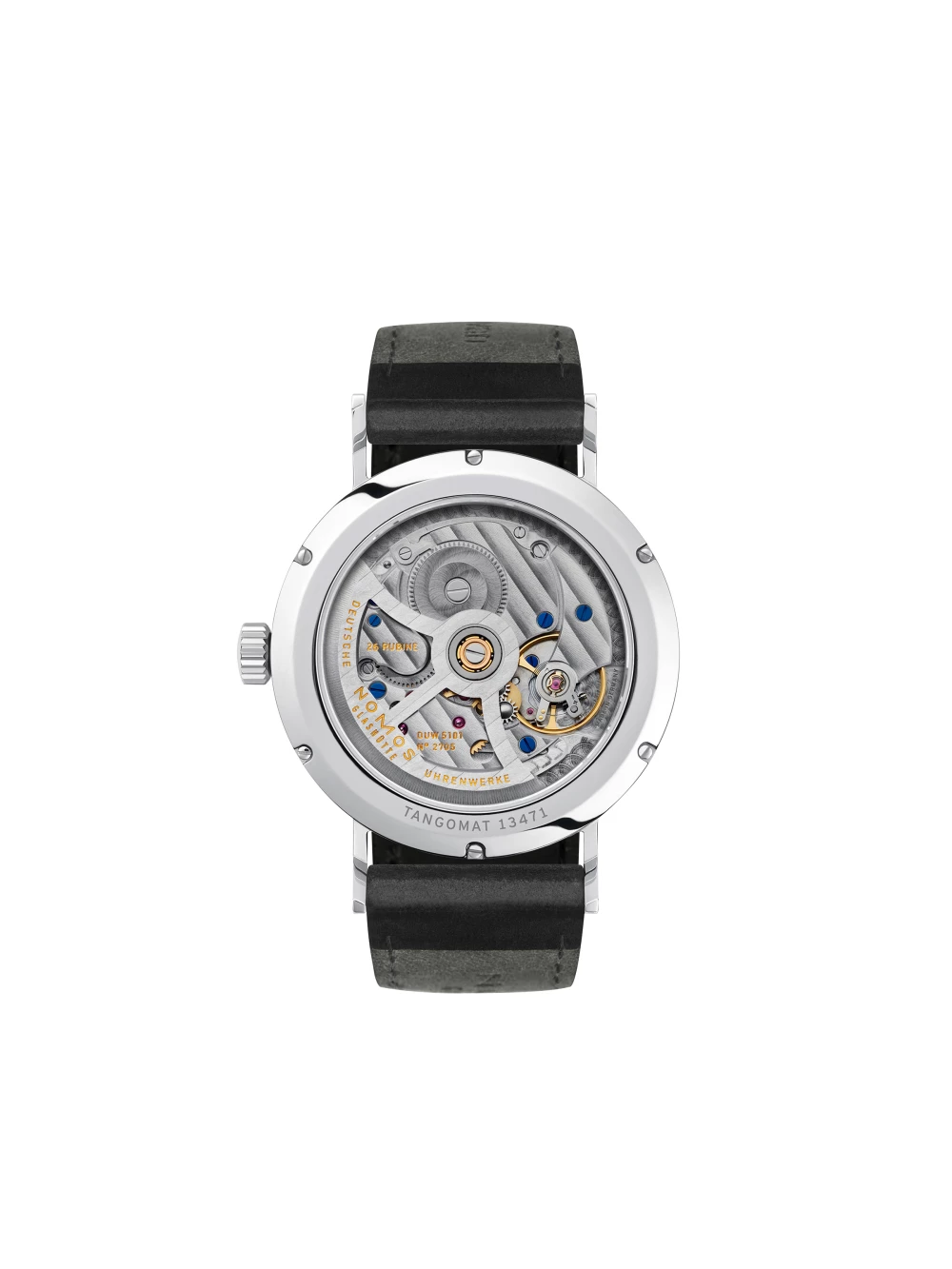 Like the legendary Tangente, the Tangomat, reference 602, also presents a classic, minimalist, Bauhaus-inspired aesthetic. It includes the five digits, cornflower-blue hands, and small seconds. This stainless-steel watch, 39 x 8.2 millimeters large, is driven by a manufacture caliber with an automatic movement. Inside it there is a DUW 5001 with NOMOS swing system ensuring precision. The Tangomat, reference 602, sits astride a leather strap made of Horween Genuine Shell Cordovan.